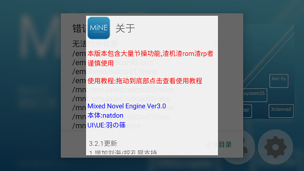 1、游戏运行至少需要0.txt或nscripter.dat、arc.nsa和default.ttf文件,缺少任何一项都无法启动。启动MiNE时,若未授权存储权限,将弹出授权请求。